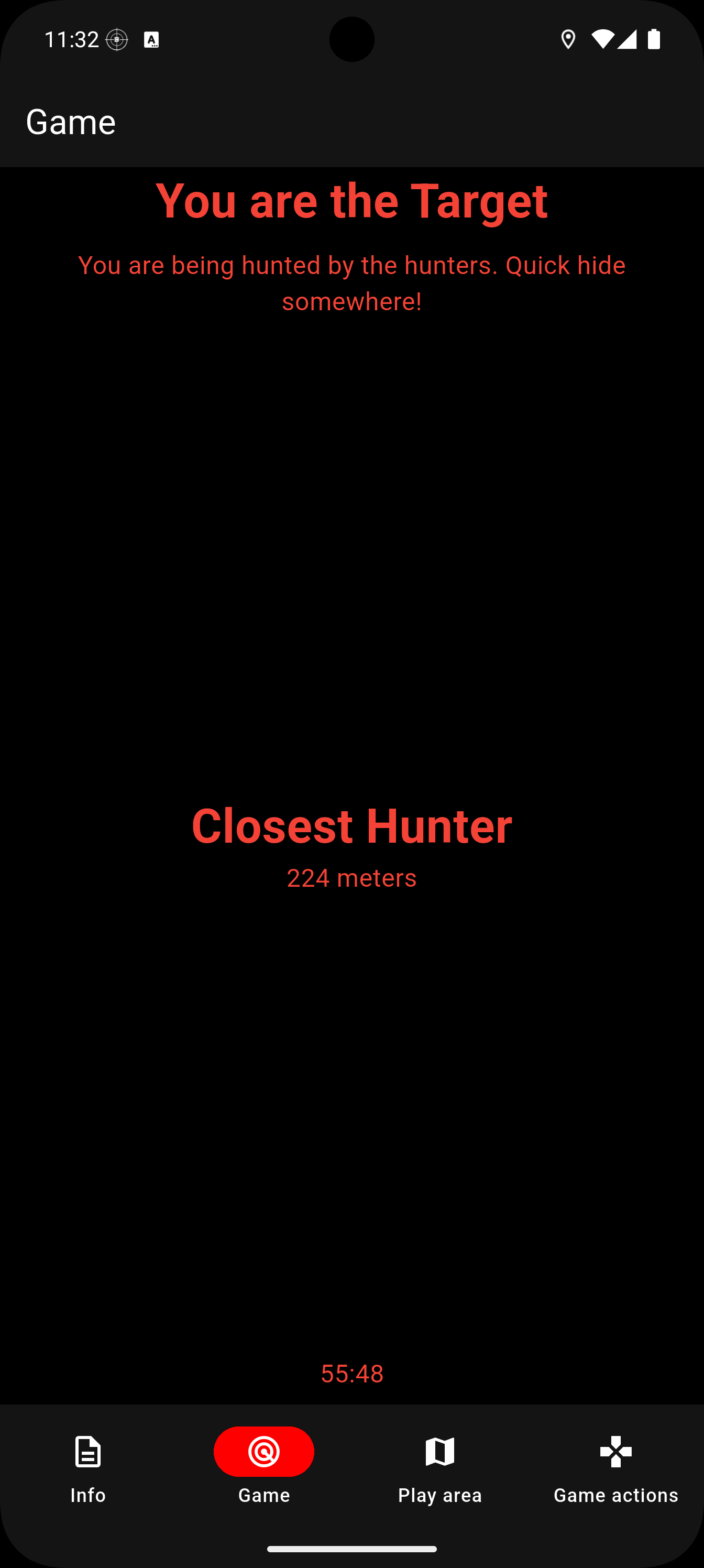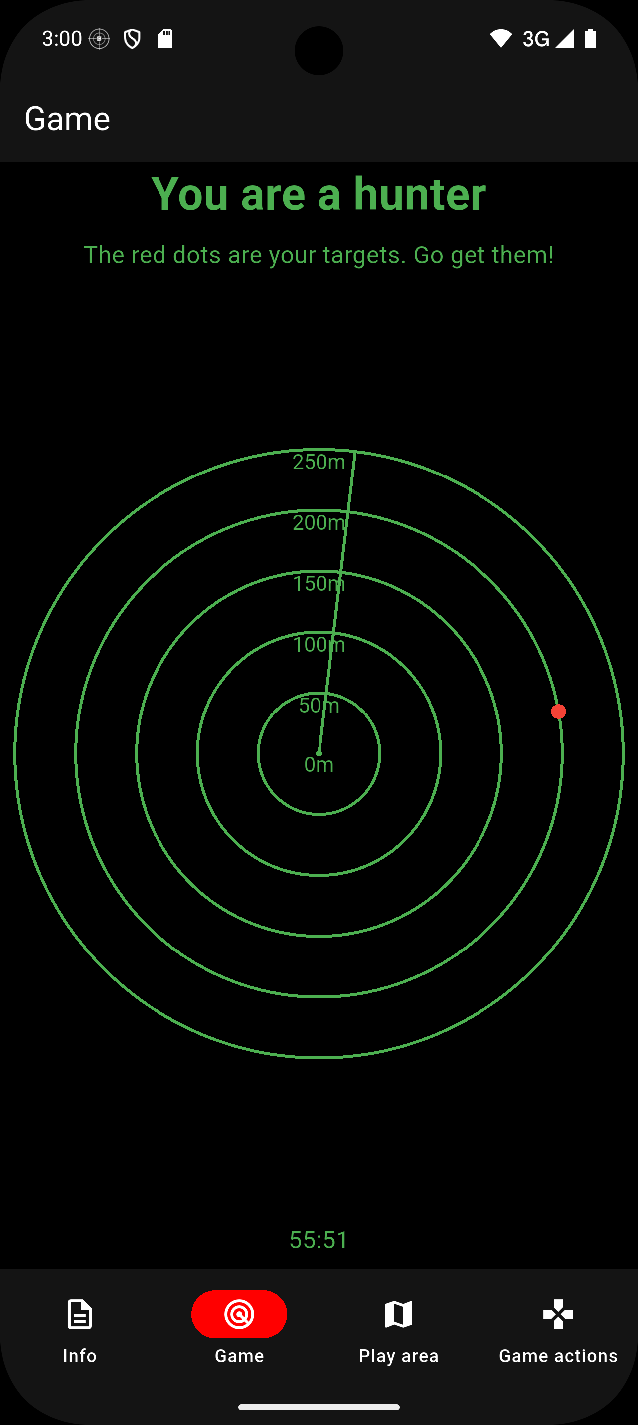 At the start of the game, all players must disperse and move away from one another. After a designated period, the game officially begins. Each player receives their role: the hunters are tasked with locating and capturing the targets. To assist the hunters, the app provides a radar display that indicates the direction and distance of the targets, represented by red blips.